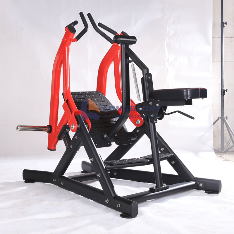 시티드 로우 머신. 등 두께를 키우는 핵심 운동입니다. 8~12회씩 4~6세트를 수행하세요.