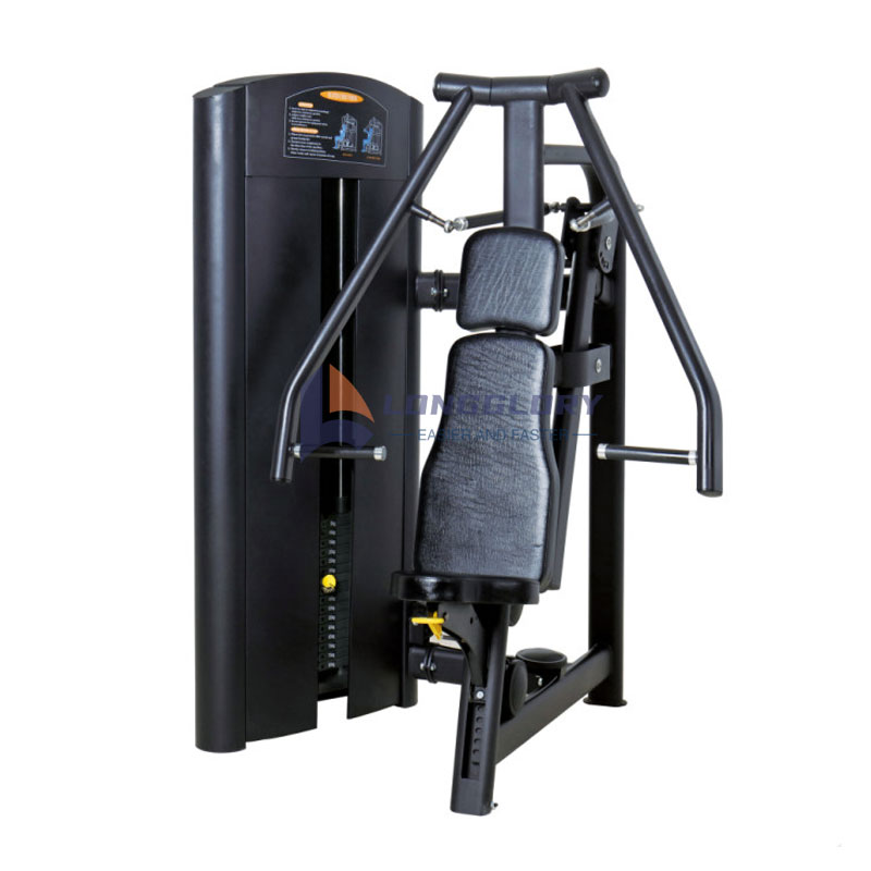 손잡이가 가슴 위쪽과 일직선이 되도록 좌석을 조정하세요. 적절한 무게를 설정하고 머리, 등 위쪽, 엉덩이를 등받이에 단단히 고정하고 코어를 맞물립니다. 가슴을 들어 올리고 시선은 앞으로 향하게 하세요. 손잡이를 잡고 깊게 숨을 들이쉬고, 숨을 내쉬면서 가슴을 활성화하면서 앞으로 밀어냅니다. 팔꿈치를 완전히 잠그지 마십시오. 최고 지점에서 잠시 멈췄다가 숨을 들이쉬면서 천천히 돌아옵니다. 통제된 자세로 동작을 반복하세요.